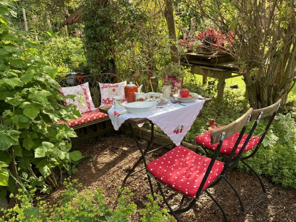 Verschlungene Wege führen durch den Garten vorbei an gemütlichen Sitzecken, die Ute Böhne an geeigneten Plätzen aufgestellt hat. Sie sind liebevoll mit bestickten Kissen, Deckchen und mit schönen Porzellan ausgestattet und laden zum Ausruhen und Träumen ein.