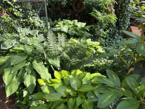 Ein ehemaliges Schwimmbad mit einem Springbrunnen und ein Mühlteich mit einer Entenfamilie werten das Grundstück auf. Bäume, Sträucher, Stauden, Sukkulenten und Rosen sind zu bewundern. Eine zweifarbige Rose und verschiedene Funkien ziehen die Blicke der Besucher auf sich.