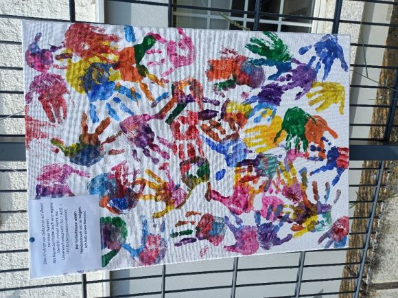 Südhemmern. Am Freitag 16.06.23 fand das Sommerfest der evangelischen Kita und Familienzentrum Südhemmern statt. Viele Besucher*innen tummelten sich auf dem Gelände an der Mindener Straße. Es gab einige Stände um aktiv mit den Kindern zu spielen. Das wurde von beiden Seiten gern in Anspruch genommen. Außerdem war die Talentfabrik mit einem Stand vor Ort und bastelte Windräder. Die Väter waren interessiert und aktiv dabei. Im Garten hinter dem Haus wurde der Pfad der Kinderrechte präsentiert. Die Mädchen und Jungen hatten in Arbeitsgruppen zu den Kinderrechten kreativ gearbeitet. Foto: Handabdruck für das Recht auf einen Namen.