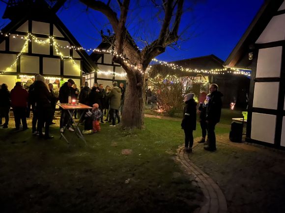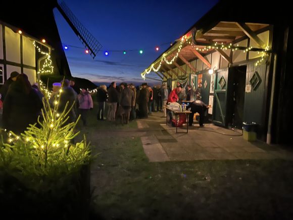 Viele Lichterketten schmückten die Mühle und das Gelände. Bierzeltgarnituren und Stehtische waren aufgebaut. Die Scheune, adventlich geschmückt, lud zum Aufwärmen ein. Die Jagdhornbläser sorgten für den musikalischen Rahmen. Für das leibliche Wohl gab es mit Bratwurst, Stippgrütze, kalten und heißen Getränken ein reichhaltiges Angebot.
