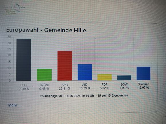 Mit 33,4 Prozent ist die CDU auch in Hille die Wahlsiegerin. Gefolgt von der SPD, die 23,9 Prozent erreichte. Die Grünen haben mit 9,5 Prozent ihr Ergebnis zur Europawahl 2019 halbiert. Die FDP erreichte 5,0 Prozent und das Bündnis Sahra Wagenknecht 3,9 Prozent. Die AfD konnte 13,3 Prozent einfahren und war in Hille nicht so erfolgreich wie in anderen Städten und Gemeinden. Die Wahlbeteiligung lag mit 68,6 Prozent.über dem Kreisdurchschnitt.