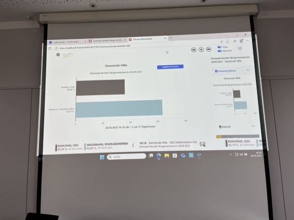 Auf einer großen Leinwand wurden die Wahlergebnisse gezeigt. Sobald die Stimmzettel in einem Wahlbezirk ausgezählt waren, wurden sie auf der Leinwand gezeigt. Schon die ersten Meldungen zeigten den Trend deutlich an. Der graue Balken, der für Waßmann stand, lag gleich schon bei 60 Prozent, für den braunen Balken, der für Rohlfing stand, blieben nur 40 Prozent.