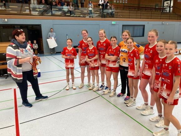 Nach dem Spiel, den Freudentänzen und Umarmungen fand am Rand des Spielfeldes die Siegerehrung statt. Andrea Meier, Vertreterin des Handballkreises, überreichte jeder Spielerin unter großem Jubel und Applaus der Fans die begehrte Medaille.