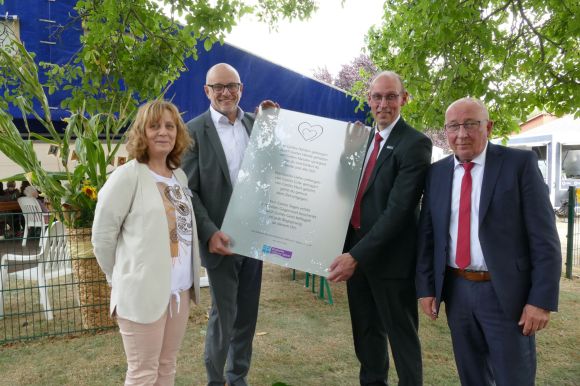 Foto: jubilaeum_ah-hille_dss: Zum 21-jährigen Jubiläum des Altenpflegeheims Hille überreichten Christian Schultz und Thomas Lunkenheimer (2. und 3. v.l.), kaufmännischer und theologischer Vorstand der Diakonie Stiftung Salem, Einrichtungsleiterin Iris Bulmahn (l.) einen Haussegen. Auch Bürgermeister Michael Schweiß (r.) gratulierte zum Jubiläum. | Quelle: Diakonie Stiftung Salem