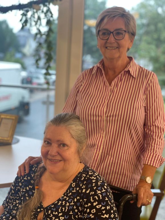 Iris Stock (stehend) betreut liebevoll eine Bewohnerin in der Seniorenresidenz