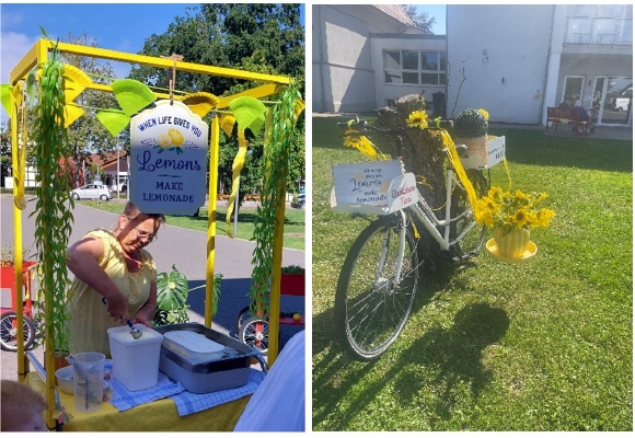 Im August feierten wir bei 25 Grad draußen ein tolles Sommerfest unter dem Motto „Wenn das Leben Dir Zitronen gibt, mach Limonade daraus“. Vier Bewohnerinnen haben gemeinsam mit einer Mitarbeiterin den Aufsatz und die Dekoration des „Eiswagens“ sowie die Dekoration unseres Sommerfestes maßgeblich mit gestaltet.