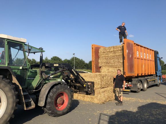 Hille-Eickhorst. Am letzten Freitag war in Eickhorst an der Burgstädt viel los. Auf dem Vorhof des Kuhstalles der Familie von Behren wurden mit Trecker und Anhänger große Mengen Tierfutter angeliefert und auf Lkws verladen. Es handelte sich um gepresste Stroh- und Heuballen sowie um in Folie verpackte Silage. Die Lkws transportierten das Futter in die Überschwemmungsgebiete, wo es an besonderen Sammelstellen abgeladen und an die betroffenen Landwirte verteilt wurde.