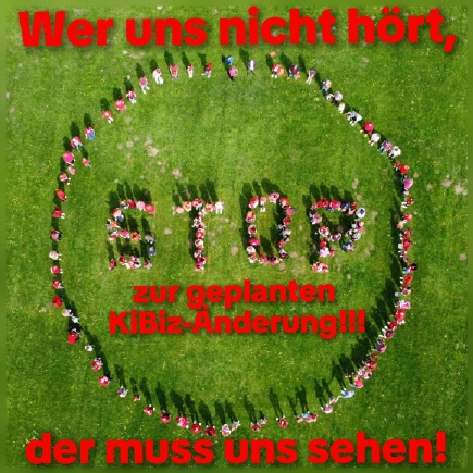 Am Freitag 17.04. versammelten sich ca 150 Menschen, Kitapersonal der Hiller Kitas, Eltern mit ihren Kindern und Unterstützer*innen auf dem Eickhorster Sportplatz. Sie zeigten der Landesregierung die rote Karte für das neue Kiibiz Gesetz. Alle zusammen stellten das Wort STOP.