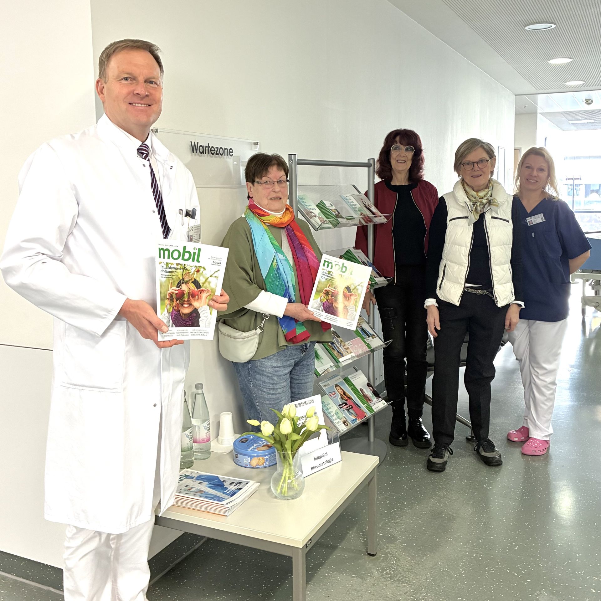 Auf dem Foto von links nach rechts Prof.Dr. Gunter Aßmann, Klinikdirektor Rheumatologie, Ursula Borgmann, Elke Krüger (Ehrenamtliche der AG Minden), Christina Droneberg, Vorstandsmitglied Deutsche Rheuma-Liga NRW e.V., Kathleen Kammann, Rheumatologische Fachassistenz und Ansprechpartnerin für die Rheuma-Liga
