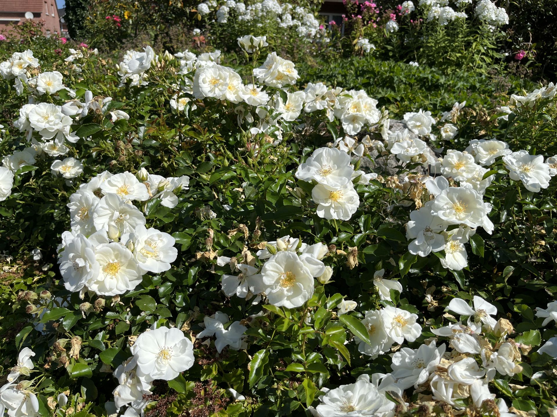 Zur Pflege im Sommer zählt Verblühtes zu entfernen und die Rosen in Trockenperioden zu wässern. Da Rosen zu den Starkzehren zählen, sollten sie nach der ersten Blüte noch einmal gedüngt werden. Auf Krankheiten und Schädlinge ist zu achten aber bei Befall von Blattläusen sollte nicht gleich die Giftspritze zum Einsatz kommen, sondern man sollte es erst mit alten Hausmitteln probieren, z.B. mit einer Wasser/Milchlösung.