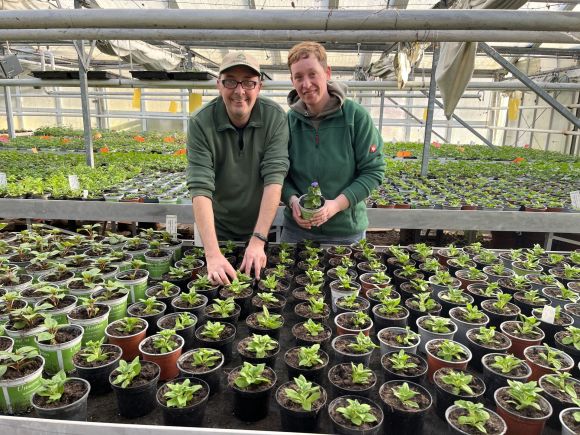 Wie von Jessica und Michael Engel zu erfahren war, ziehen sie die Blumen selbst heran. Es gab für sie keinen „Gärtner – Winterschlaf“. Mitte Januar wurden die Stecklinge geliefert. Die mussten dann pikiert, d.h. in größere Blumentöpfe gepflanzt werden. Die zarten Pflänzchen fanden einen geeigneten Platz im Gewächshaus. Sie sind bis in den Mai liebevoll zu pflegen, damit sie zu kräftigen Pflanzen heranwachsen. Die vorgeschriebene Temperatur und Bodenfeuchtigkeit muss Tag und Nacht beachtet werden. Auch das Ausputzen und Zurückschneiden gehört zu den Pflegearbeiten.
